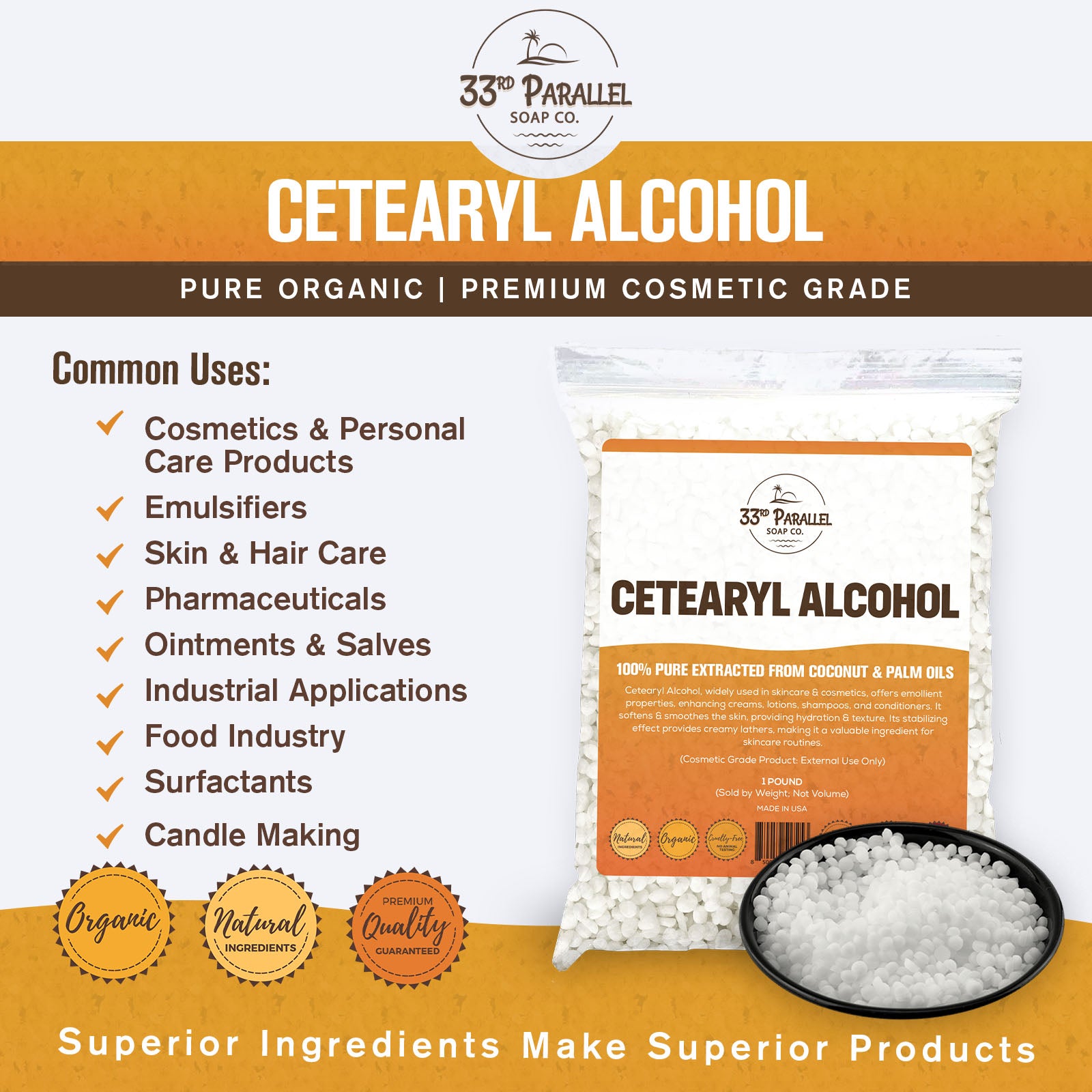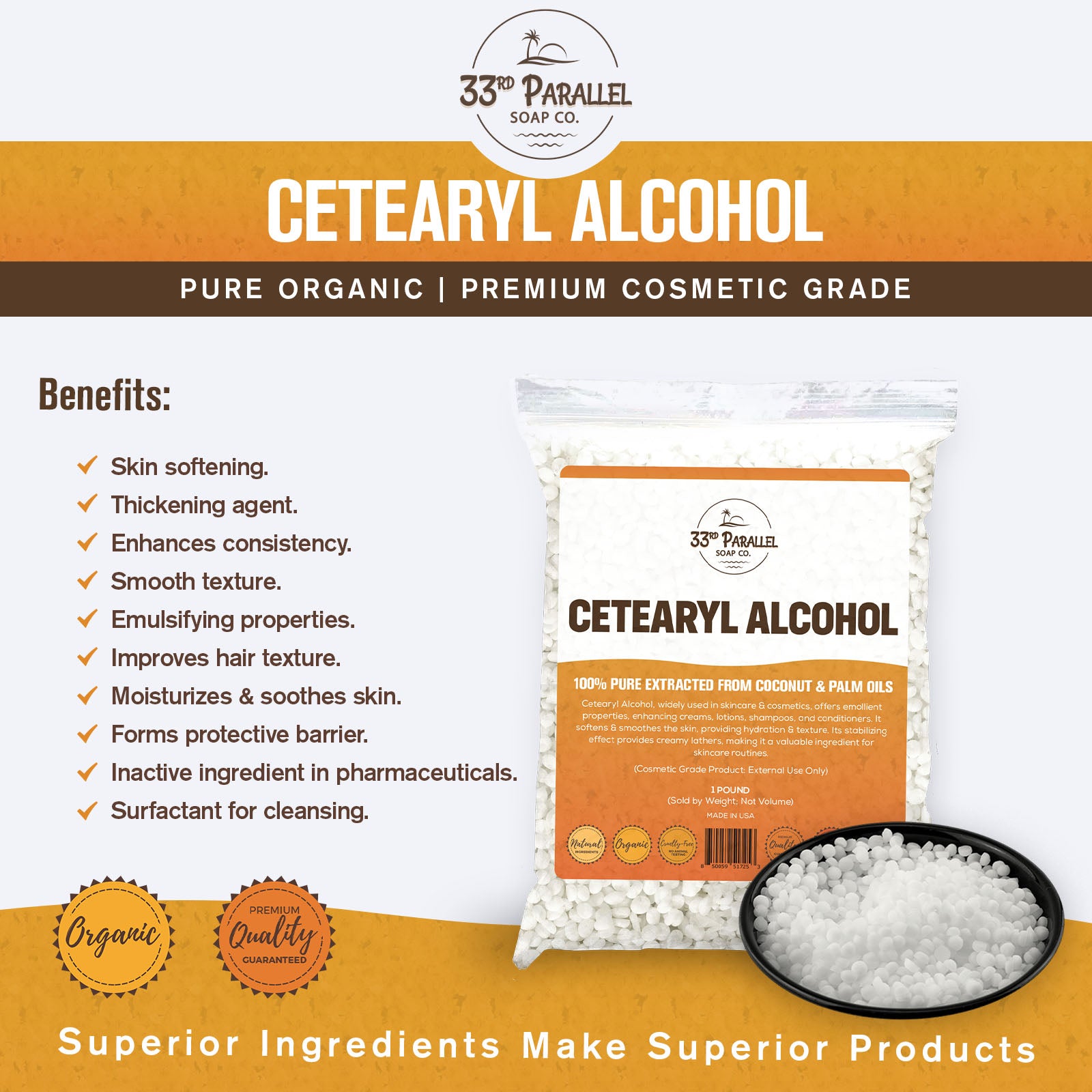 Upgrade your DIY skincare and haircare with 100% our pure Cetearyl Alcohol. A must-have for smooth, stable lotions, creams & more. Add it to your formulas today to produce a richer and creamier lather, enhanced performance, and pro-quality results.