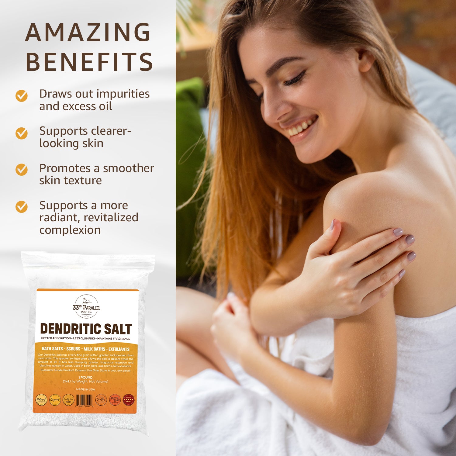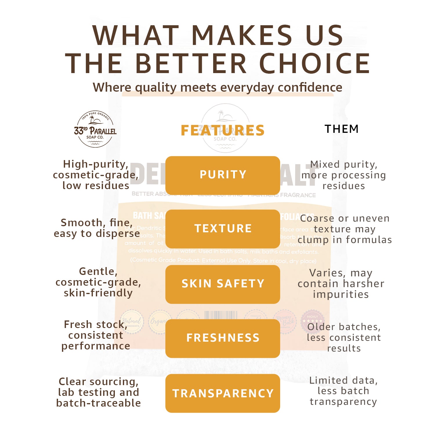 Our premium dendritic salt is ultra-fine for better fragrance absorption and scent retention. Perfect for bath salts, scrubs, and milk baths. Dissolves quickly, clumps less, and enhances every soak or scrub with longer-lasting scent and smooth texture.
