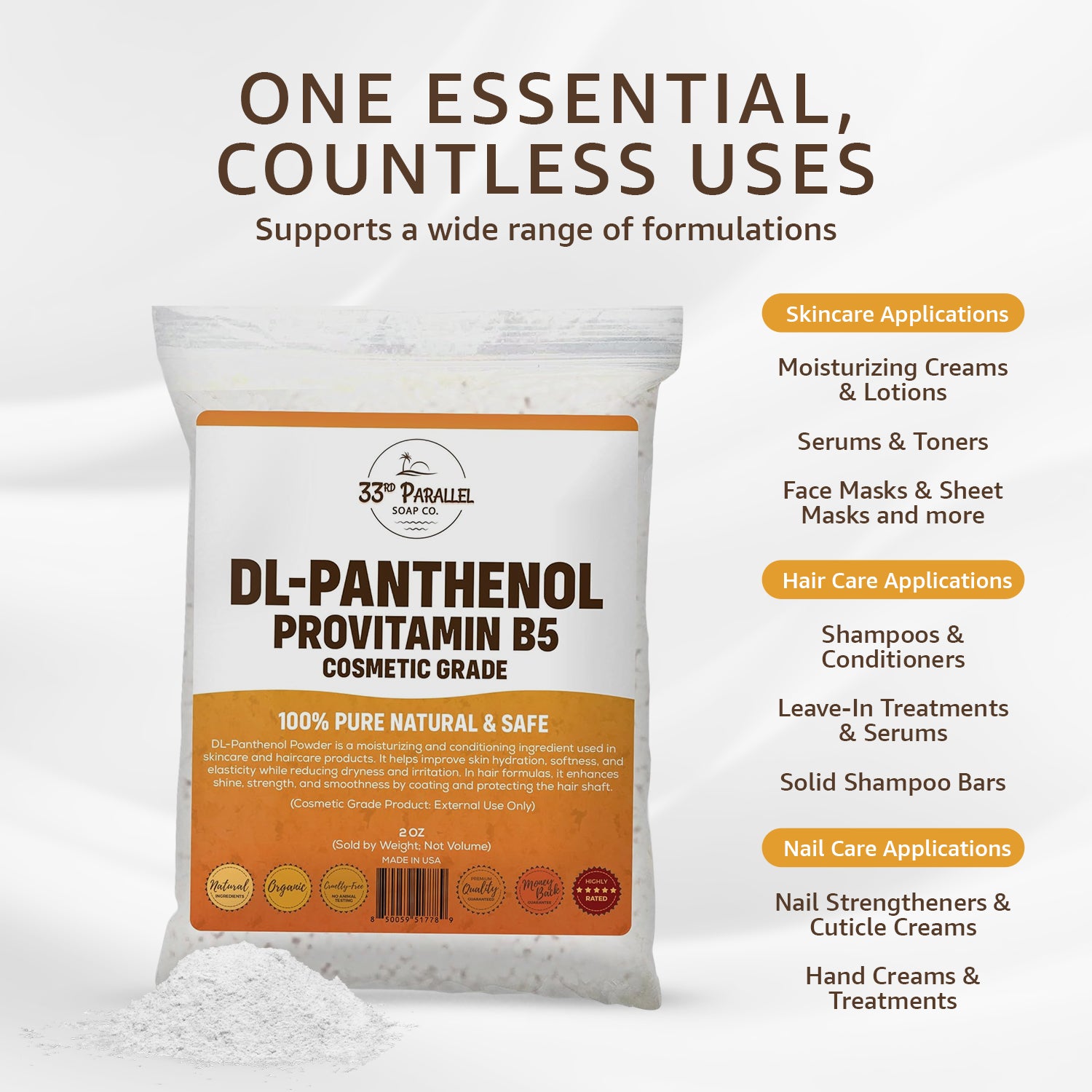 DL-Panthenol Powder (Provitamin B5) is a premium, 100% pure cosmetic ingredient that deeply hydrates skin, strengthens hair, and conditions nails. Ideal for skincare, haircare, and nailcare formulations, it promotes softness, shine, elasticity, and overall health.