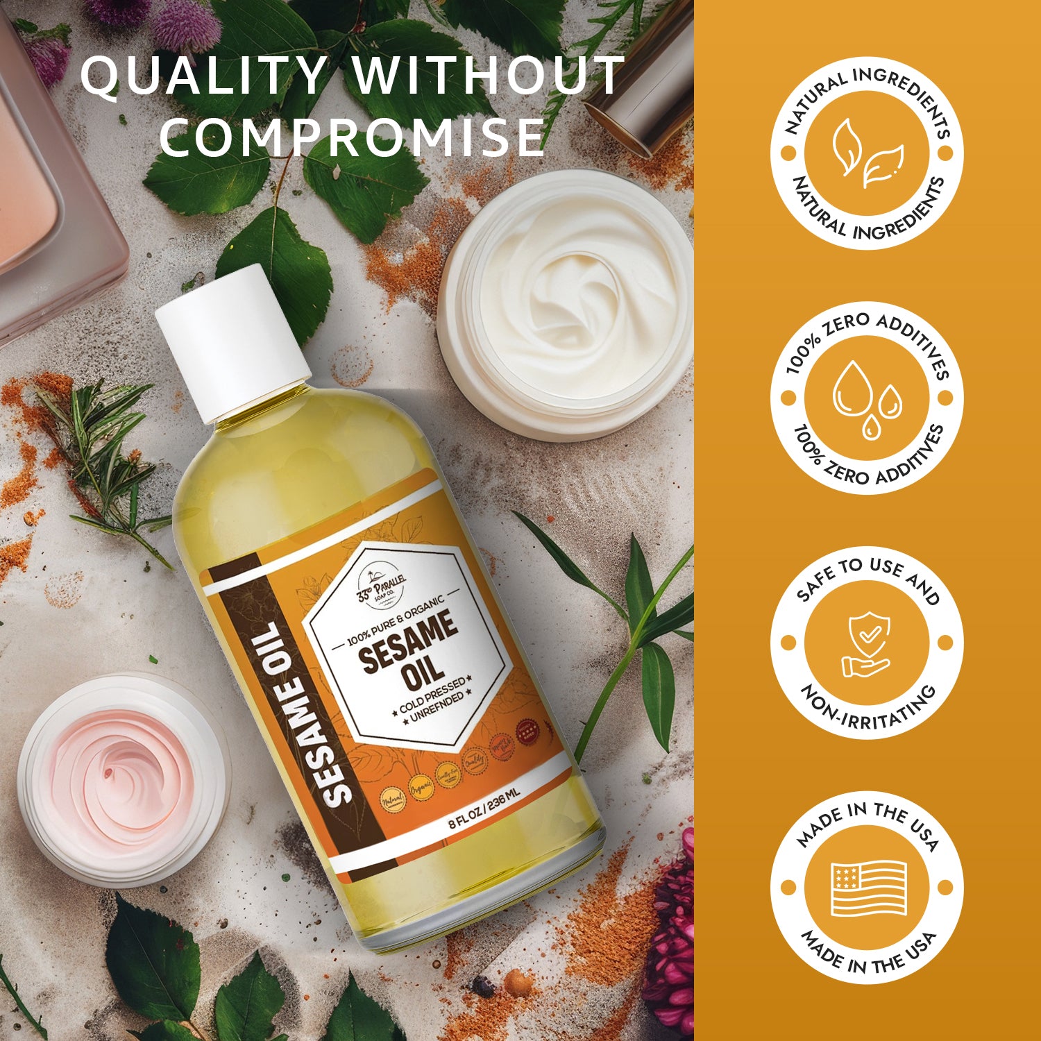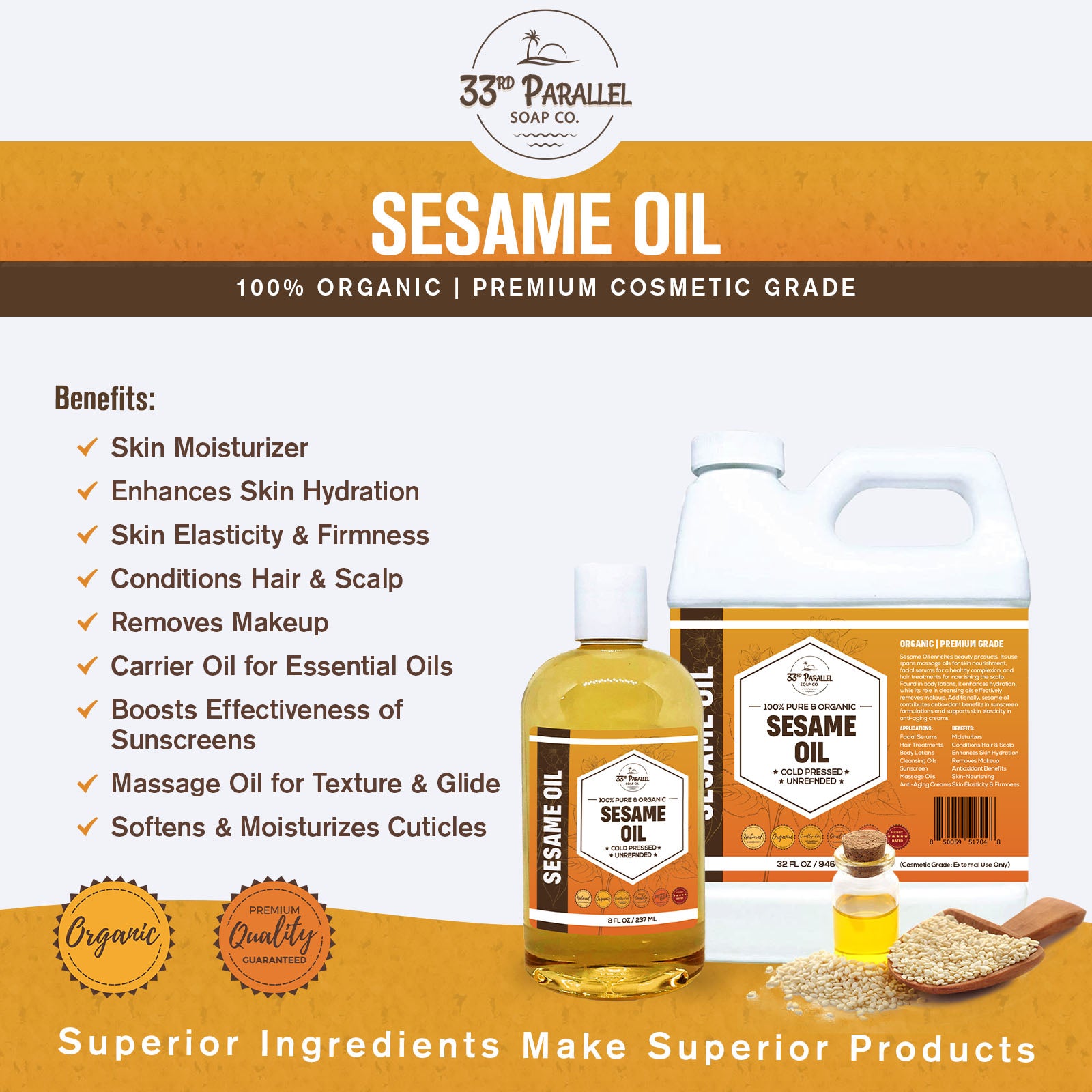 Our premium, organic sesame oil is 100% pure, cold-pressed, and nutrient-rich. It moisturizes skin, strengthens hair, and is widely used in massage therapy and aromatherapy as a soothing, antioxidant-packed carrier oil for essential oils.